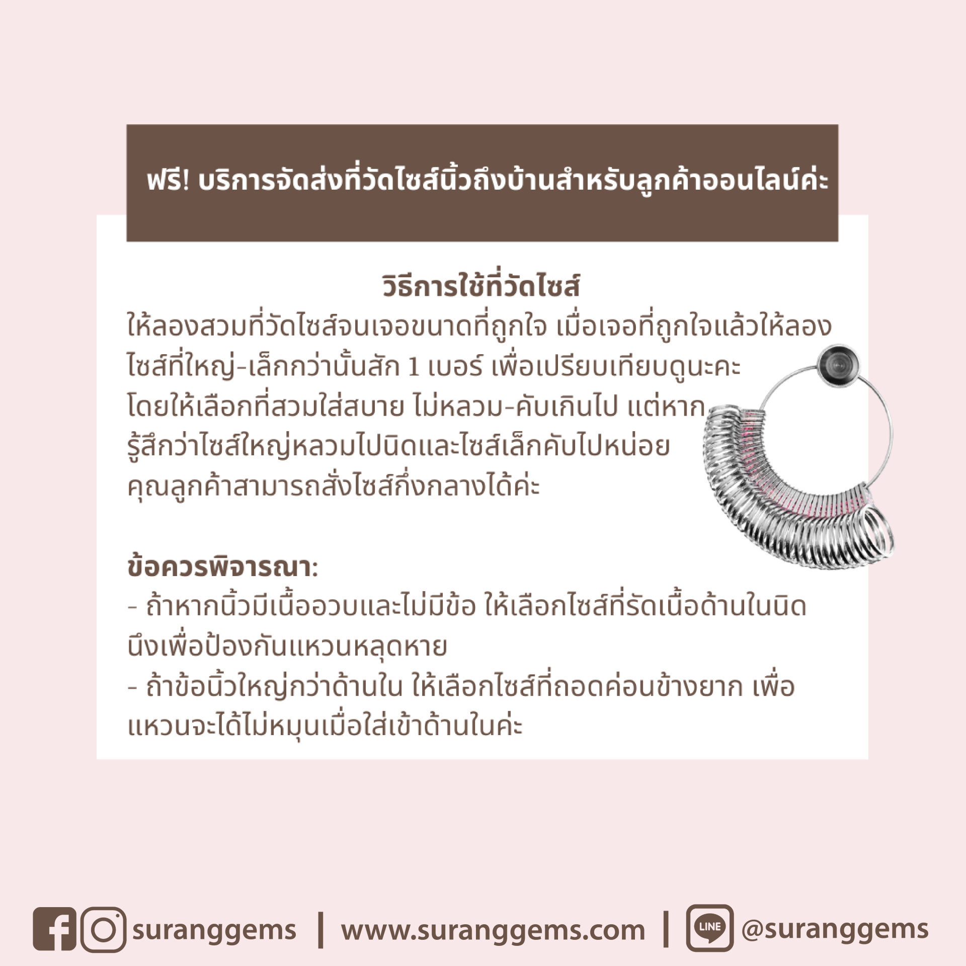 กรณีที่ขนาดแหวนไม่พอดี Surang Gems มีบริการปรับไซส์ให้ฟรี 1 ครั้ง โดยปรับไซส์ขึ้น-ลงได้ไม่เกิน 3 ไซส์ คุณลูกค้าสามารถซื้อแหวนไปก่อน แล้วค่อยนำมาปรับไซส์กับเราภายหลังได้เช่นกันค่ะ ดังนั้นไม่ต้องเป็นกังวลเลยนะคะ