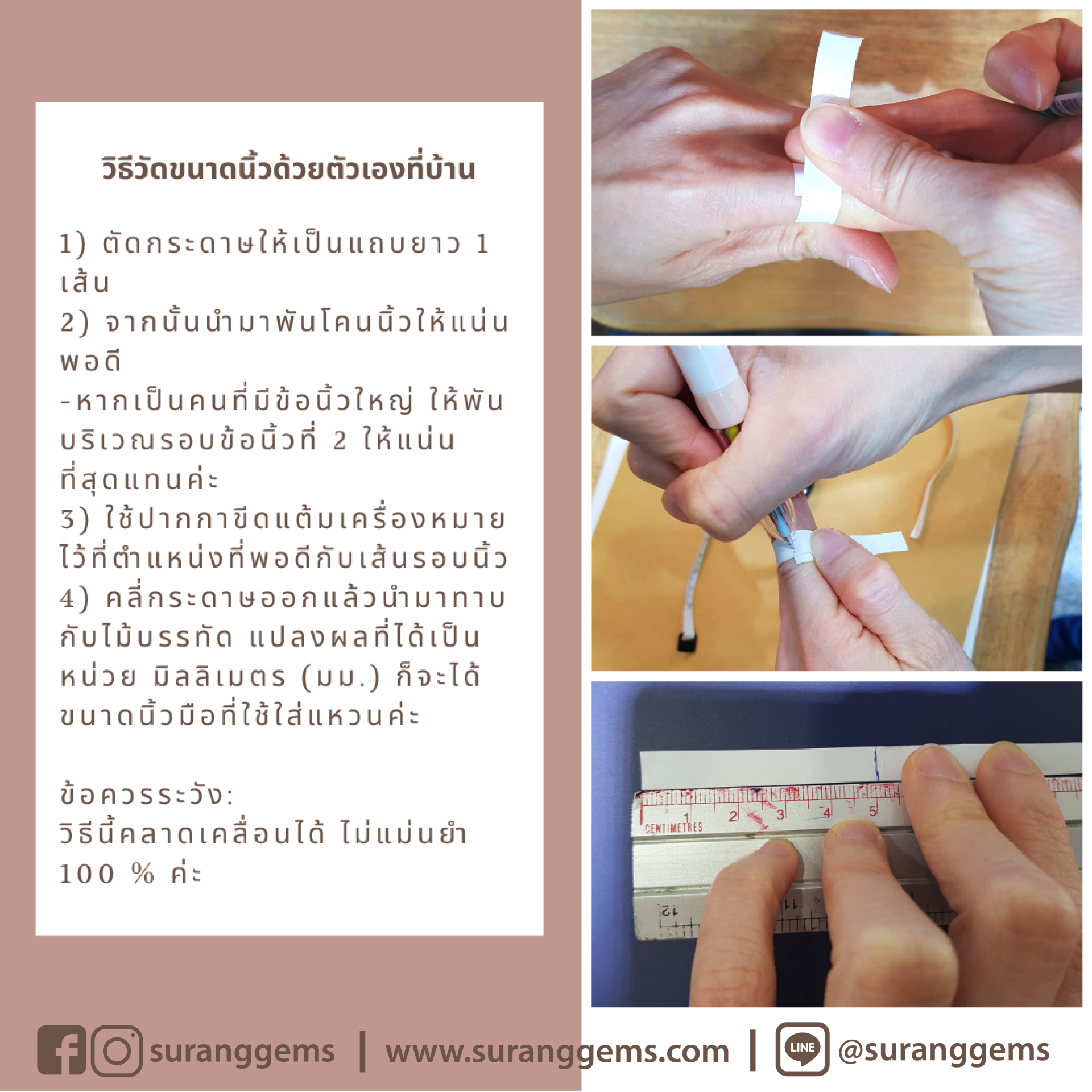 ให้ยืมแหวนมาให้ที่ร้านวัดให้ โดยจะต้องเป็นนิ้วเดียวกันกับแหวนที่จะซื้อให้นะคะ ซึ่งวิธีนี้เป็นวิธีที่แม่นยำที่สุดค่ะ